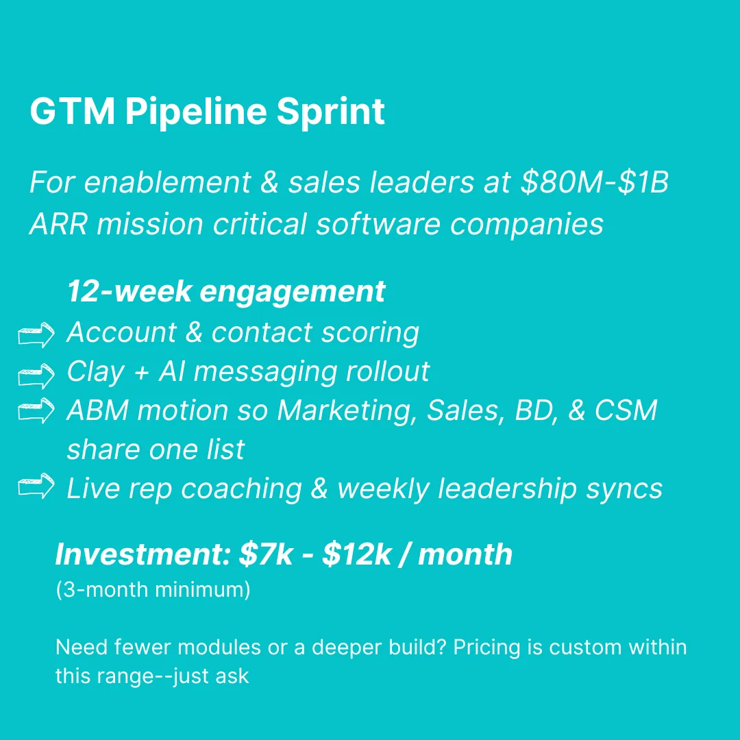 If you're an $80M-$500M software companymoving up-market, maybe inbound channel leads dried up or aren't converting at the rates during ZIRP, we can help. We'll build your GTM into a value-engineered, AI-driven, signal-based motion that re-ignites pipeline.